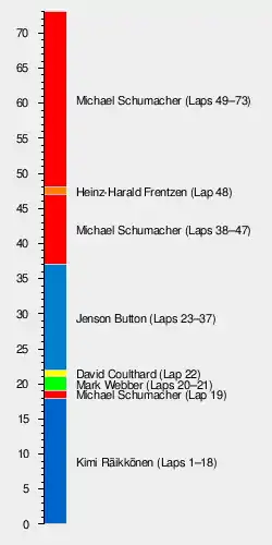 Ralf Schumacher began closing up on race leader Räikkönen on lap 10, pulling to within a second of him by the 14th lap.[78] Coulthard, Montoya and Alonso were close behind each other as all three duelled for third with the circuit now completely dry.[80] Michael Schumacher set the race's fastest lap of 1:11.473 on lap 13.[75] On lap 15, Montoya overtook Coulthard for third at turn one,[78] before Alonso passed Coulthard for fourth three turns later.[80] Ralf Schumacher made his first scheduled pit stop at the end of that lap. He rejoined the track in 12th.[81] During lap 17, Coulthard was pressured by Michael Schumacher between turns two and three.[78] Montoya and Coulthard made their first pit stops for fuel and tyres when the lap ended.[80] Montoya lost time when the refuelling hose nozzle failed to attach the first time, necessitating a switch to a backup system.[77][86] He fell behind Coulthard and into 11th.[81]