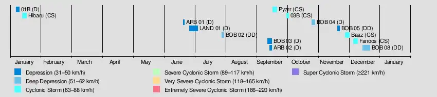 The season was the sixth in a row with below normal activity, based on the seasonal accumulated cyclone energy. Storms generally develop when the monsoon trough is located over tropical waters, with a peak from May to June and another peak in November.[2] The monsoon developed 11 distinct low-pressure areas by the end of September, including five monsoon depressions,[3] and the monsoon season was more active than usual.[1]