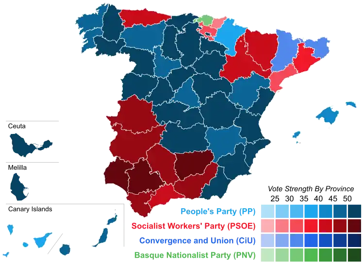 The election saw the first national victory for the People's Party (PP) since the 2000 Spanish general election, scoring 42.1% of the share in its best showing in a European Parliament election to date, as well as its third best in a national election overall. The ruling Spanish Socialist Workers' Party (PSOE), on the other hand, fell to second place with 38.8% of the votes after a cycle of electoral victories starting in 2004. As in the previous election, the result was close, as both parties came within three percentage points of each other. The Coalition for Europe (CEU), the alliance of regionalist and peripheral nationalist parties that came to succeed the late Galeusca–Peoples of Europe coalition, remained in third place with 5.1% of the votes, whereas United Left (IU)—which ran under The Left banner—saw its worst showing in a nationwide election up to that point, barely surpassing 3.7% of the share. On the other hand, the new Union, Progress and Democracy (UPyD) party had a strong performance by comfortably doubling its result from the 2008 Spanish general election, being the only national party that saw a net gain of votes compared to that electoral contest. The abertzale left-supported Internationalist Initiative–Solidarity among Peoples (II–SP) candidacy, which had been initially banned from running by the Supreme Court of Spain but later allowed by the Constitutional Court on the grounds that there was not enough evidence of its ties to the ETA terrorist group,[1][2] scored 1.1% of the votes nationwide but failed to secure any parliamentary representation.