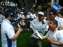 There were demonstrations supporting and opposing Zelaya's removal from power. The Zelaya administration was investigated and prosecuted in the absence of Zelaya.[100][101] Some organisations reported human rights violations[75][102][103][104][105][106] and media restrictions.[107]