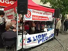 The Communist Party, led by Vojtěch Filip, ran a campaign focused on young voters, and held meetings with potential voters in town squares around the country, culminating in a huge rally on Náměstí Republiky, Prague.[61] Younger party activists also attended meetings to attract young voters. The party's campaign used the slogan "With the People, For the People" and also featured celebrities who supported the party, such as singers Martin Maxa and Jana Kociánová.[29]