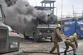 ![]() ![]() Top: Manipur commandos fire teargas shells to disperse protesters. Bottom: Emergency personnels extinguishing a burning security vehicle. | |