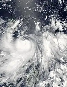 On March 18, the JTWC reported that an area of deep atmospheric convection had persisted about 325 km (202 mi) to the southeast of Chuuk Island in southern Micronesia.[26] At this stage the poorly organised deep convection was located over a low level circulation center and was in an area of low wind shear.[26] Over the next couple of days both the low level circulation center and the deep convection gradually became better organized, prompting the issuance of a Tropical Cyclone Formation Alert late on March 20.[27][28][29] During the next day convection continued to build over the low level circulation center, which became well defined whilst moving around the subtropical ridge.[30] The JTWC then initiated advisories on the system later that day, designating it as Tropical Depression 02W, although the JMA did not designate the system as a tropical depression until early on March 22.[30] During March 22 further development of the system was hampered by an anticyclone to the east of the system that caused moderate to strong wind shear.[31][32] Early of the next day, JTWC upgraded the depression into a tropical storm, and on 24 March JMA upgraded it to Tropical Storm Omais, the first of the season. Late on March 25, the JTWC downgraded Omais to tropical depression strength. Tropical Depression Omais re-gained tropical storm status late on March 26 as it was becoming extratropical.[33]