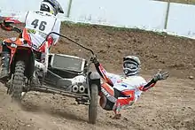The Sidecarcross World Championship, first held in 1980 and organised by the Fédération Internationale de Motocyclisme, is an annual competition. All races, manufacturers and the vast majority of riders in the competition being in and from Europe.[1][3] Sidecarcross is similar to motocross except that the teams consist of two riders, a driver and a passenger. Races are held on the same tracks as solo motocross but the handling of the machines differs as sidecars don't lean. The majority of physical work in the sport is carried out by the passenger, who speeds up the sidecarcross in corners by leaning out. The coordination between the driver and the passenger are therefore of highest importance.[4]