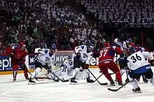 Russia went through the group undefeated by winning all seven games. Co-host Sweden captured the second place, after falling short to Russia.[15] Czech Republic rounded up the third place and advanced to the quarterfinals. Norway, Latvia and Germany all fought for the last spot in the next round but Germany was eliminated after failing miserably 4–12 to Norway.[16] Latvia lost to Denmark and was eliminated,[17] which meant that Norway advanced. Italy finished last and was relegated to Division I.[18] In the quarterfinals, Russia took on Norway, while Sweden battled the Czech Republic.