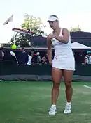 Agnieszka Radwańska began the season with a semifinal appearance at Apia International Sydney and a quarterfinal finish at the Australian Open.[36] She claimed her first title of the year at the Dubai Tennis Championships over Julia Görges, 7–5, 6–4.[37] She claimed her second title of the year at the Sony Ericsson Open by defeating Maria Sharapova in the final, 7–5, 6–4.[21] In the clay season, she reached two semifinals, before losing in her opening match in the Internazionali BNL d'Italia to Petra Cetkovská, 4–6, 6–4, 1–6, her first lost to a player other than Azarenka in the year.[38] However, she bounced back by winning the Brussels Open over Simona Halep, 7–5, 6–0.[39] At the French Open, she fell to Svetlana Kuznetsova in the third round, 1–6, 2–6.[40] At Wimbledon, she reached the first Grand Slam singles final of her career, losing to Serena Williams, 1–6, 7–5, 2–6.[41] At the Summer Olympics, she was upset in the first round by Julia Görges, 5–7, 7–6(7–5), 4–6.[42] At the US Open, she lost for the first time to Roberta Vinci in the fourth round, 1–6, 4–6.[43] She reached the final of the 2012 Toray Pan Pacific Open, where she was the defending champion, but was upset in the final by Nadia Petrova, 0–6, 6–1, 3–6.[44]
