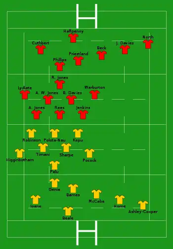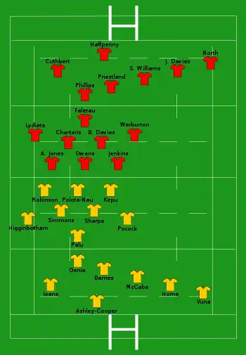 | Try: Higginbotham 14' c Genia 40' c McCabe 66' c Con: Barnes (3/3) 15', 42', 67' Pen: Barnes (1/3) 8' Drop: Barnes (1/1) 49' | Report[4] | Try: Cuthbert 57' c Con: Halfpenny (1/1) 59' Pen: Halfpenny (4/4) 21', 45', 55', 62' |