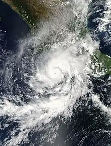 Due to the storm's large size,[29] a "green" alert (low risk) was issued for the states of Colima, Jalisco and Michoacán while a "blue" alert (minimum risk) was placed into effect for the states of Nayarit, Guerrero,[30] and Baja California Sur.[31] As the system passed through the Revillagigedo Islands, winds reached 42 mph (68 km/h) on Socorro Island.[32] The outer rainbands brought moderate rains to Guerrero,[33] causing minor flooding in Acapulco. Across the state, the storm generated 24 landslides,[34] which blocked highways.[33] Two people were killed in the Guerrero, one a tourist that drowned in Zihuatanejo[35] and the other a police officer in an airplane crash that injured 19 others.[36] High seas flooded numerous buildings across coastal towns in Colima,[37][38] damaging 34 tourist facilities and killing one person.[39] Additionally, many restaurants built of wood and coconut were damaged. In Manzanillo, the port was closed to small craft,[40] as was the port of Mazatlán.[41] Overall, 50 homes were damaged by the storm.[42]