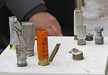 A report published on 25 January by Armament Research Services, a specialty arms and munitions consultancy in Perth, Australia, says the mysterious cufflink-shaped projectiles presumably fired by riot police on Hrushevskoho Street at protesters during clashes this week are not meant for riot control, but for stopping vehicles, busting through doors and piercing armor. The bullets, writes Jenzen-Jones, who specializes in Eastern bloc weapons, are special armor-piercing 12-gauge shotgun projectiles, likely developed and produced by the Spetstekhnika (Specialized Equipment) design bureau, a facility located in Kyiv and associated with the Ministry of Internal Affairs.[124]