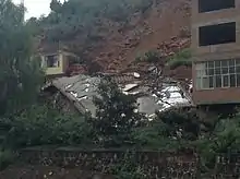 The 2014 Ludian earthquake struck Ludian County, Yunnan, China, with a moment magnitude of 6.1 on 3 August.[10] The earthquake killed at least 617 people, injuring at least 2,400 others.[11][12] As of 5 August 2014, 112 people remain missing.[13] Over 12,000 houses collapsed and 30,000 were damaged.[14] According to the United States Geological Survey, the earthquake occurred 29 km (18 mi) WSW of Zhaotong city at 16:30 local time (08:30 UTC).[15][16][17]