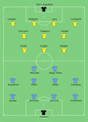 In Sweden the match was broadcast live on TV12.[3] Martin Strömbergsson from Gävle was the referee for match, his first time officiating the competition. His older brother Markus had previously officiated three Svenska Supercupen matches. Malmö FF won the match on penalties 5–4 after the match had ended 2–2 after extra time. IF Elfsborg took the lead through Viktor Claesson in the first half, Malmö FF equalized Elfsborg's lead in the 89th minute of ordinary time. Malmö FF then took the lead through Emil Forsberg in the second half of extra time, only to have their lead equalized by Viktor Prodell on a penalty in the last minute of extra time. The match proceeded to penalties which Malmö FF won 5–4 after Elfsborg had missed their last two penalties. This was the first time Svenska Supercupen went to extra time and penalties in its eight-year history.
