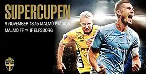 Svenska Supercupen 2014, Swedish Super Cup 2014, was the 8th Svenska Supercupen, an annual football match contested by the winners of the previous season's Allsvenskan and Svenska Cupen competitions. The match was played at Malmö Stadion, Malmö, on 9 November 2014, and was played by the 2014 Allsvenskan champions Malmö FF and the 2013–14 Svenska Cupen champions IF Elfsborg. The match was IF Elfsborg's second in the competition and their first since 2007. It was Malmö FF's second successive appearance and third in total, it was also the first time that the competition was hosted at Malmö Stadion and the first time the competition was hosted at an alternative home venue.
