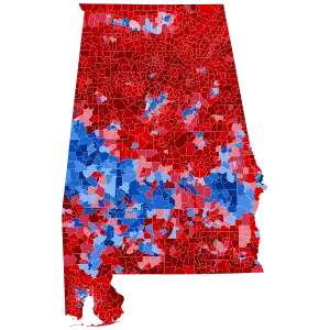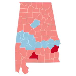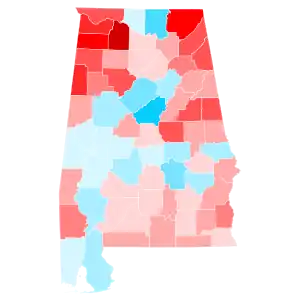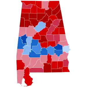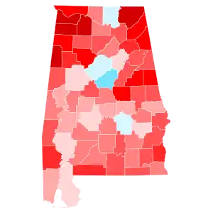 Alabama has voted for the Republican candidate in every election since it was won by Ronald Reagan in 1980. As such, Trump was heavily favored to win the state. On the day of the election, Trump won the election in Alabama with 62.08% of the vote, while Clinton received 34.36% of the vote.[3] The state had given 60.55% of its votes to Republican nominee Mitt Romney in 2012, meaning that it had shifted 1.53% more Republican from the previous election. Trump's margin of victory in Alabama was 27.72%, a 5.53% increase from Romney's 22.19% margin of victory. This makes it the largest loss by a Democrat since Democratic nominee George McGovern in 1972. On the other hand, Trump became the first Republican to win the White House without carrying Jefferson County since Richard Nixon in 1968, and Clinton the first Democrat since Adlai Stevenson II in 1952 to carry the county without winning the White House.