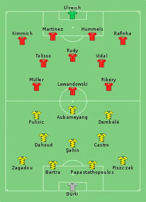 Christian Pulisic opened the scoring for Borussia Dortmund in the 12th minute when he ran in on goal and shot low with his right foot past the advancing Sven Ulreich. Robert Lewandowski made it 1–1 in the 18th minute when he finished with his right foot from close range after a low cross from the right by Joshua Kimmich. Pierre-Emerick Aubameyang made it 2–1 in the 71st minute when he clipped the ball over the advancing Sven Ulreich from the right of the penalty area with his right foot.[10]