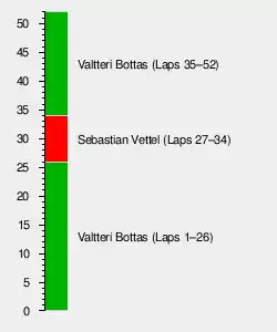 Because of Alonso's car obstructing the track, the start was aborted by the FIA's race director Charlie Whiting, and the cars were sent on an additional formation lap. The race was accordingly shortened by a lap. Valtteri Bottas attained his maiden victory after taking first place at the start, passing both Ferraris before turn 2 – aided by starting from the clean side of the grid, and picking up the slipstream behind Vettel. Hamilton attempted the same, but was squeezed on both sides by the Ferrari of Räikkönen, now running 3rd – and Ricciardo of Red Bull, challenging for 4th from 5th. This caused him to be held up and hemmed into his starting grid position, where he would stay for the remainder of the race. Vettel meanwhile pulled away from tight racing of the main straight, and pursued Bottas. Vettel briefly led the race when Bottas went into the pits following his one-stop strategy, but then lost his position again after his own pit stop. He again spent the final third of the race gradually closing the distance between himself and Bottas, coming to within 0.7 seconds just a few laps before the end. Lapped traffic, particularly the delayed Williams of Massa, however, ultimately prevented him from overtaking the race leader, leading to a secure second place for the German. Kimi Räikkönen rounded off the podium. He once again set a late fastest lap of 1:36.844 on lap 49, recording not only the fast lap of the race, but also the fastest ever lap at the circuit. At the chequered flag, he was followed by Lewis Hamilton, finishing a distant 4th. Hamilton had struggled with overheating throughout the race.[11]