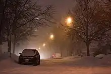 Another storm began on February 11, with some areas in the Midwestern and Northeastern United States expected to receive up to 12 inches (30 cm) of snow in the upcoming days, as well as parts of Ontario and Quebec expected to receive 14 inches (36 cm).[37] In Toronto, all schools were closed on February 12 in anticipation of the storm.[38] The city saw up to 15 cm (6 in) of snow followed by sleet and freezing rain. Ice and snow in Chicago resulted in 70,000 ComEd power outages.[39] The storm's maximum snowfall accumulation was 26.5 inches (67 cm), which fell near Negaunee, Michigan. Ice secretion peaked at half an inch north of Toledo, Ohio.[40]