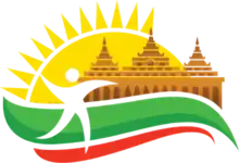 The emblem or logo of the 19th ASEAN University Games is designed to include a coloured pattern used in the National Flag of Myanmar. The yellow represents belief, serenity and wisdom. The golden beams shining from the yellow sun are symbolic of 11 ASEAN countries. The green is used to depict peace, harmony and unity. This colour also symbolizes a range of mountains covered with plants and trees. The red is representative of courage, bravery and loyalty. It also symbolizes the current situation of Myanmar moving steadily towards being a federal democratic country. The white star, depicted as an athlete doing warm-up exercises, is used as a symbol of a sport competition. The Parliament Complex, symbolic of the Capital of Myanmar, implies that the 19th ASEAN University Games will be held in Nay Pyi Taw.[4]
