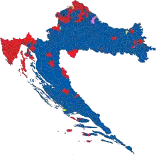 - ↑ Of the 66 seats won by the HDZ-led alliance, the HDZ won 62, the Croatian Social Liberal Party won two and the Croatian Christian Democratic Party and Croatian Democratic Alliance of Slavonia and Baranja won one each.