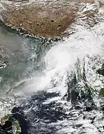 At 00:00 UTC on May 16, a depression formed in the southeast Bay of Bengal and was identified as BOB 01. Six hours later, the India Meteorological Department (IMD) upgraded the system to a deep depression. The system began bringing torrential rainfall to Sri Lanka and Southern India. Around 15:00 UTC, the system further developed into Cyclonic Storm Amphan.[2][3] That morning, landslide and flooding warnings were hoisted for parts of eastern Sri Lanka and the Indian state of Kerala were given expectations of torrential rainfall in the coming days.[4] By 09:00 UTC on May 17, Amphan had intensified into a very severe cyclonic storm. Within 12 hours, the storm had developed an eye and started to rapidly intensify, becoming an extremely severe cyclonic storm. According to the JTWC, it explosively intensified from a Category 1-equivalent cyclone to a Category 4-equivalent cyclone in just 6 hours. The following morning around 10:30 UTC, the IMD upgraded Amphan to a super cyclonic storm with 3-minute sustained winds of 240 km/h (150 mph) and a minimum pressure of 920 hectopascals (27.17 inHg). This marked the second year in a row featuring a super cyclonic storm, the previous year seeing Kyarr in the Arabian Sea. On May 20, at approximately 17:30 IST, the cyclone made landfall near Bakkhali, West Bengal after weakening subsequently. It rapidly weakened once inland, and dissipated on the next day. It left behind a trail of catastrophic damage, and was later confirmed to be the costliest storm ever recorded in the basin.