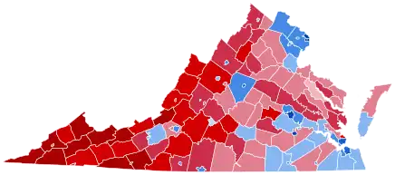 Prior to the election, most news organizations considered this a state Biden would win, or a likely blue state. On the day of the election, Biden won Virginia with 54.15% of the vote, and by a margin of 10.2%, the best performance for a Democratic presidential candidate since Franklin D. Roosevelt in 1944.[4] Trump became the first Republican incumbent to consecutively lose Virginia since William Howard Taft and Biden became the first Democratic nominee to win Chesterfield County and Lynchburg City since 1948, Virginia Beach City since 1964, James City County since 1968, and Stafford County since 1976.[5] He also flipped Chesapeake City back to the Democratic Party. Trump flipped no counties or independent cities in the state. Nevertheless, Biden became the first Democrat since 1992 to win without Buckingham County and Essex County, and the first since 1960 to win without Westmoreland County, a notable bellwether. He was the first Democrat to ever win without Caroline County, Nelson County, or Covington.