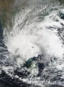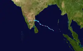 On 6 November, the IMD noted the formation of a cyclonic circulation over southeastern Bay of Bengal near Sumatra.[3] Two days later at 13:30 UTC (19:00 IST), the JTWC started tracking the same system as Invest 91B.[4] On 9 November, under the influence of the cyclonic circulation, a low-pressure area formed over the same area.[5] On the next day, it was upgraded to a well-marked low pressure area after the IMD noted the formation of a defined vortex in association with the system.[6][7] At 15:00 UTC (21:30 IST), the IMD further upgraded it to a depression as its convective structure had improved significantly.[8] By 19:30 UTC (01:00 IST), the JTWC issued a TCFA for system.[9] At 09:00 UTC of 11 November, the JTWC declared it as a tropical cyclone and designated as 04B. According to the JTWC, this system had slightly higher wind speeds, since it peaked as a tropical storm with winds of 65 km/h (40 mph).[10] However, the system could not further intensify, due to land interaction as well as high wind shear produced by an upper tropospheric ridge.[10][11] Between 12:00 and 13:00 UTC (17:30 and 18:30 IST), the system made landfall very close to Chennai at the same intensity,[12] and by 00:00 UTC (05:30 IST) the next day the system weakened into a well-marked low pressure area.[13] The JTWC issued its final advisory at 15:00 UTC of 11 November as it moved further inland into Tamil Nadu.[14]