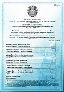 - 1 2 "A meeting of the Central Election Commission was held on the provision of voter lists to polling stations, approval of the text of the ballot paper and accreditation of international observers". www.election.gov.kz. 31 October 2022. Retrieved 14 November 2022.