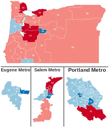 The 2022 Oregon House of Representatives election was held on Tuesday, November 8, 2022. Primary elections were held on Tuesday, May 17, 2022.[1] Voters in the 60 districts of the Oregon House of Representatives elected their representatives. The elections coincided with the elections for other offices, including for State Senate.