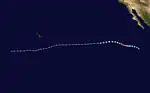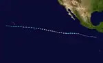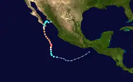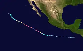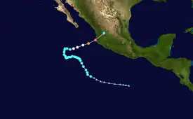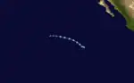 Forecasts at the outset of the 2023 season predicted busier-than-normal tropical cyclone activity in the eastern Pacific basin, largely due to El Niño.[6] However, no tropical cyclones formed in the first six weeks of the season. When the first system, Hurricane Adrian, developed on June 27, it became the second-latest forming first named storm in the eastern Pacific in the satellite era (since 1971), only behind Tropical Storm Agatha in 2016.[7] In July, Hurricane Calvin became the season's first major hurricane, later passing just south of the Big Island of Hawaii as a tropical storm, bringing widespread rainfall to the area and neighboring Maui. In August, Category 4 Hurricane Dora passed south of the Hawaiian Islands and contributed to strong gradient winds over Hawaii, which in turn helped fan the flames of multiple devastating wildfires. [3] Later that month, Hurricane Hilary made landfall as a tropical storm in Baja California, later bringing torrential rainfall and gusty winds to the Southwestern United States. In early September, Hurricane Jova, the first Category 5 hurricane in the basin since 2018, caused rainfall, high waves and rip currents in areas previously affected by Hilary.