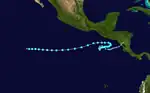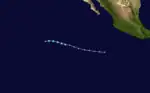 On August 23, a trough of low pressure formed far to the south of the Baja California peninsula.[115] Early on August 27, the disturbance organized, becoming Tropical Depression Ten-E.[116] Amid marginally favorable conditions, the system was able to strengthen, becoming Tropical Storm Irwin twelve hours later.[117] Irwin remained a poorly organized storm, struggling to generate sustained convection in account of increasingly cooler water temperatures and low relative humidity.[118] Consequently, it degenerated to a post-tropical cyclone on August 29.[119]