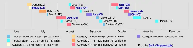 The 2023 Pacific hurricane season was an active and destructive Pacific hurricane season. In the Eastern Pacific basin (east of 140°W), 17 named storms formed; 10 of those became hurricanes, of which 8 strengthened into major hurricanes – double the seasonal average.[nb 1][2] In the Central Pacific basin (between 140°W and the International Date Line), no tropical cyclones formed (for the fourth consecutive season), though four entered into the basin from the east.[3][4] Collectively, the season would rack up an above-normal accumulated cyclone energy (ACE) rating of approximately 164 units. This season saw the return of El Niño and its associated warmer sea surface temperatures in the basin, which fueled the rapid intensification of several powerful storms. It officially began on May 15, 2023 in the Eastern Pacific, and on June 1 in the Central; both ended on November 30. These dates, adopted by convention, historically describe the period in each year when most tropical cyclogenesis occurs in these regions of the Pacific.[5]