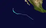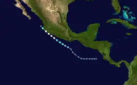 On August 1, a tropical wave emerged offshore Guatemala.[75] A low-pressure area developed a couple days later, as it passed southwest of Mexico.[76] After further organization, the disturbance developed into a tropical depression around 12:00 UTC on August 5. Moving northwestward toward the southern tip of the Baja California peninsula under favorable conditions, the system began to rapidly intensify, becoming Tropical Storm Eugene six hours later, and attaining peak sustained winds of 70 mph (110 km/h) at 12:00 UTC on August 6.[75] What appeared on satellite imagery to be a possible eye feature was observed at the center of the storm, but soon deteriorated.[77] Later, Eugene moved over cold water west of the Baja California peninsula where its diminishing thunderstorm activity ceased, and it transitioned into a post-tropical cyclone on the afternoon of August 7.[78] The system never directly affect any land areas,[75] though its remnants carried isolated rain showers to the San Francisco Bay Area a few days later.[79]