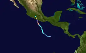 On June 23, a broad area of low pressure formed off the coast of southern Mexico, in an area which the NHC had for several days been monitoring for potential tropical development.[32] The disturbance quickly became better organized on June 27, and advisories were initiated on Tropical Storm Adrian at 21:00 UTC that same day.[33] Adrian strengthened rapidly, and became the season's first hurricane at 15:00 UTC on June 28, while located about 360 mi (580 km) southwest of Manzanillo, Colima.[34] It then reached Category 2 hurricane status on June 30, with the hurricane maintaining a distinct eye surrounded by a ring of −70 °C (−95 °F) convection on satellite.[35] Adrian reached maximum sustained winds of 105 mph (165 km/h) that day,[36] before entering an environment of stronger wind shear and cool sea surface temperatures, causing it to weaken to a tropical storm the next day. Adrian weakened to a tropical depression early on July 2,[37] and degenerated into a remnant low later that day.[38]