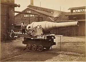 Imperial Russia was an important early customer for Krupp guns. In 1865 Krupp made a 21 cm Ring Kanone for Russia. In 1866, a 23 cm gun which was later changed to a Ring Kanone. In 1867, Krupp made a 28 cm cannon for Russia.[7] This 28 cm was really a gun of 11 inch caliber. It was cast in a single piece in 1864. It was later changed to breechloading with a simple Krupp horizontal sliding wedge and Broadwell ring, and was ringed, i.e. changed to a built-up gun.[8]