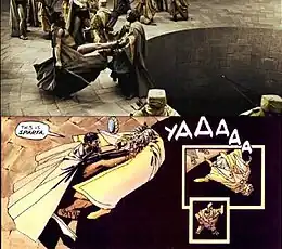 The film is a shot-for-shot adaptation of the comic book, similar to the film adaptation of Sin City.[14] Snyder photocopied panels from the comic book, from which he planned the preceding and succeeding shots. "It was a fun process for me… to have a frame as a goal to get to," he said.[15] Like the comic book, the adaptation also used the character Dilios as a narrator. Snyder used this narrative technique to show the audience that the surreal "Frank Miller world" of 300 was told from a subjective perspective. By using Dilios' gift of storytelling, he was able to introduce fantasy elements into the film, explaining that "Dilios is a guy who knows how not to wreck a good story with truth."[16] Snyder also added the subplot in which Queen Gorgo attempts to rally support for her husband.[17]