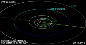 Geraldina (minor planet designation: 300 Geraldina) is a large Main belt asteroid.[1] It was discovered by Auguste Charlois on October 3, 1890, in Nice. The origin of the name is unknown.[2] It is orbiting the Sun at a distance of 3.21 AU with a period of 5.74 yr and an eccentricity (ovalness) of 0.057. The orbital plane is tilted at an angle of 0.73° to the plane of the ecliptic.[1]