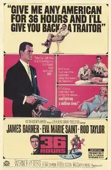 36 Hours is a 1964 American war thriller film written and directed by George Seaton from a story by Carl K. Hittleman and Luis Vance, based on the 1944 short story "Beware of the Dog" by Roald Dahl.[3] The film stars James Garner, Eva Marie Saint, Rod Taylor, and Werner Peters. In the plot, a Nazi German army doctor tries to obtain vital information from an American military intelligence officer by convincing him that it is 1950 and World War II is long over.