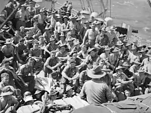 ![]() Members of the 36th Battalion are addressed by their commanding officer on a troopship en route to New Ireland in 1944 | |