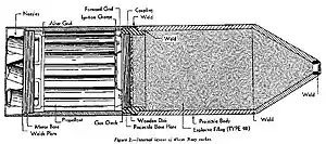 The body of the motor, warhead and nose cone were all made from 19 mm (.75 in) rolled steel and were welded together. The warhead contained 180 kg (400 lb) of trinitroanisole and in the center of the nose cone, there was a pocket that could house either a Navy nose fuze as used by the 20 cm naval rocket or Army mortar fuze.[1]
