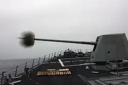 5-inch/62 caliber Mark 45 Mod 4, in flat-panel gun turret, test firing on USS Forrest Sherman