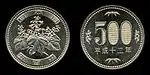 The second design for the 500 yen coin was first minted in 2000 with new anti-counterfeiting devices. Nickel-brass was used as a replacement for cupronickel giving the coins a slightly golden appearance in comparison. This metallic change made it easier for vending machines to tell the difference between genuine versus counterfeit coins.[4] The weight of the 500 yen coin was lowered from 7.2g to 7, and the thickness from 1.85 to 1.81 mm.[4][9] Changes also effected the edge as the inscriptions of "NIPPON 500" were replaced with a helically reeded edge. The overall design was not changed but enhanced with anti-counterfeiting technology which include microprinting, and features viewed only at certain angles.[10][11] This design later won the Mint Directors Conference award in 2002 as the "Most Innovative Coin Concept". It proved not enough to be a match against counterfeiters though, as they switched to using raw materials to get around the new security features.[12] While in April 2019 the Ministry of Finance announced that the 500 yen coin would be redesigned, the new coins weren't released into circulation until November 2021.[13][14]