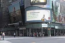 5 Times Square contains several electronic billboards on its facade, which obscure much of the second through fourth floors.[5][18] These billboards are included as part of the 42nd Street Development Project and were intended to evoke Times Square's historical signage.[18] Specifically, the building was required to contain at least 18,000 square feet (1,700 m2) of advertising signage.[20] At the northeast corner, the signs rise to the seventh story.[5] Hocking said his team used computer models to compare different types of signage.[21] However, the developers' signs had to be separate from those required by the 42nd Street Development Project.[21][22] As a result, a 22-story-tall vertical sign with the Ernst & Young name was mounted on the northeast corner of the building.[22]