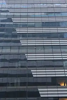 The main office entrance is in the middle of the Seventh Avenue elevation.[5] The corner of Seventh Avenue and 41st Street has an entrance to a three-story Red Lobster restaurant, with a curved revolving neon lobster measuring 10 feet (3.0 m) long.[23][24] Above the entrance is a curved sign measuring 60 feet (18 m) long.[23] The curtain wall is made of reflective-glass window panes.[25] The spandrels between stories are a mixture of reflective-glass and silver horizontal panels,[5][22] which are arranged so they appear to form a diagonal "slice".[22] The slice, as well as the massing variations, are intended to depict the diagonal route that Broadway, one block east, follows in relation to the Manhattan street grid.[5][25] The north and south elevations, as well as the cornice atop the building, contain lighting.[5] The design of the exterior was scrutinized by several governmental agencies, advocacy groups, and potential tenants.[21]