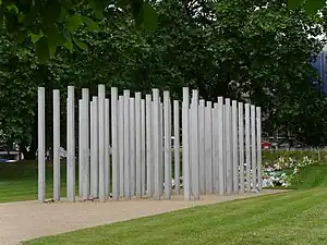 The proposal for a permanent memorial was announced on 13 February 2006, with £1 million of central government funding. The memorial was designed by a team including architects Carmody Groarke, engineers Arup, and landscape architects Colvin and Moggridge (see Brenda Colvin), advised by sculptor Antony Gormley, in consultation with representatives from the families of the victims, and also representatives from the Royal Parks and the Department for Culture, Media and Sport.[4][5][6][7] The steel was cast by Norton Cast Products of Sheffield.[8] Each pillar was cast in sand using the same mould, but using an open casting process that means each is slightly different, with a rough surface texture.[9]