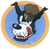 2. Approved 3 May 1945. Description: Over and through a medium blue disc, border golden orange, a caricatured gray wolf's head, trimmed black, mouth and tongue red, wearing an olive drab service cap tilted over the left eye. Maurer reverses the approval dates for the 865th and 866th Bombardment Squadrons.