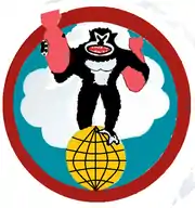 2. Approved 18 August 1944. Description: Over and through a medium blue disc, wide border dark red, a gorilla affronte, proper, standing on a yellow sphere marked with black lines of latitude and longitude, in base, and holding a large light red aerial bomb under the left arm, while hurling a like aerial bomb with an upraised right arm, all in front of a large white cloud formation.