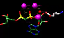The adjacent picture shows the active site of ADPRase in complex with AMPCPR and Mg2+. AMPCPR is a nonhydrolyzable analog of ADP-ribose, and thus functions as an inhibitor of ADPRase. The picture below reveals the first and second Mg2+ ions, which serve to coordinate the attacking water molecule so that it is perfectly in line with the scissile bond (O-P-O bond is 177 degrees) and poised for attack. A glutamate side chain (E162) will deprotonate the water molecule, and then the hydroxide ion will attack nucleophilically. This occurs when the water molecule is 3.0 angstroms away from the phosphorus molecule it is attacking. By using H2O18, it has been found that the water molecule attacks the adenosyl phosphate. This evidence is a refutation of a previous study that suggested that hydrolysis of ADP-ribose could proceed by nucleophilic attack at either alpha- or beta- phosphate (Gabelli, et al. 2001). After the water molecule attacks, an intermediate is formed, and then ribose 5-phosphate is kicked off as a leaving group. The third active site Mg2+ ion is used to stabilize the negative charge of the phosphate group as it leaves, and is thus situated perfectly between the two phosphates.[4]