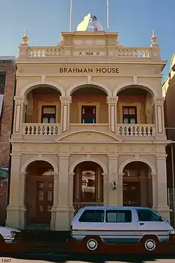 The AMP Building, currently known as Brahman House, is constructed in masonry faced most ornately with painted and modelled cement render on its loggia to East Street. Designed using classical motifs by the former Queensland Colonial Architect, FDG Stanley, this two-storey structure was built for the Australian Mutual Provident Society (AMP) in 1888.[1]