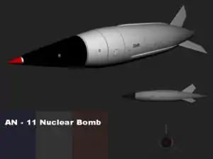 The AN-11 was a pure fission weapon, a plutonium implosion type. It weighed approximately 1,500 kg (3,306 lb). It was a free-fall bomb intended to be dropped from high-altitude bombers. The explosive nuclear weapon yield was about 60 kt.