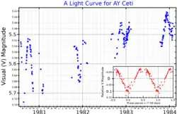 ![]() A light curve for AY Ceti. The main plot, adapted from Poretti et al.,[1] shows the long-term variability. The inset plot, adapted from Eaton et al.,[2] shows data from 1980 - 1982, folded with the photometric period. | |