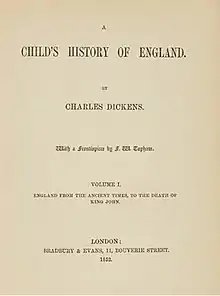 A Child's History of England is a book by Charles Dickens. It first appeared in serial form in Household Words, running from 25 January 1851 to 10 December 1853. Dickens also published the work in book form in three volumes: the first volume on 20 December 1851, the second on 25 December 1852 and the third on 24 December 1853.[1] Although the volumes were published in December, each was postdated the following year. They bore the titles: